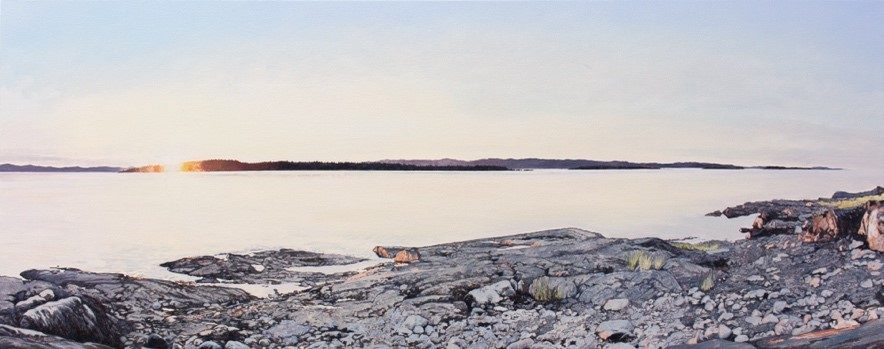 Julie Desmarais, Le soleil disparaît à l’horizon, huile sur toile, 24 x 60 pouces